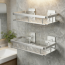 Rectangular wall-mounted bathroom shelves made from aluminium and steel provide a structured storage solution for shower and wash areas. The combination of materials supports durability while maintaining a clean and modern appearance suitable for various interior styles. The rectangular shape allows items to be arranged neatly, making it easier to access toiletries during daily use.
