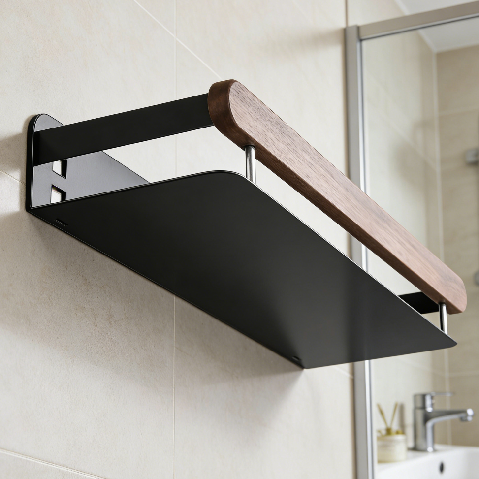 This wall-mounted bathroom storage shelf combines a black metal frame with a wood accent surface, creating a practical yet visually balanced organiser. The sturdy frame supports a range of items, from folded towels to small containers, while the wooden shelf adds a contrasting texture that suits both modern and classic interiors.